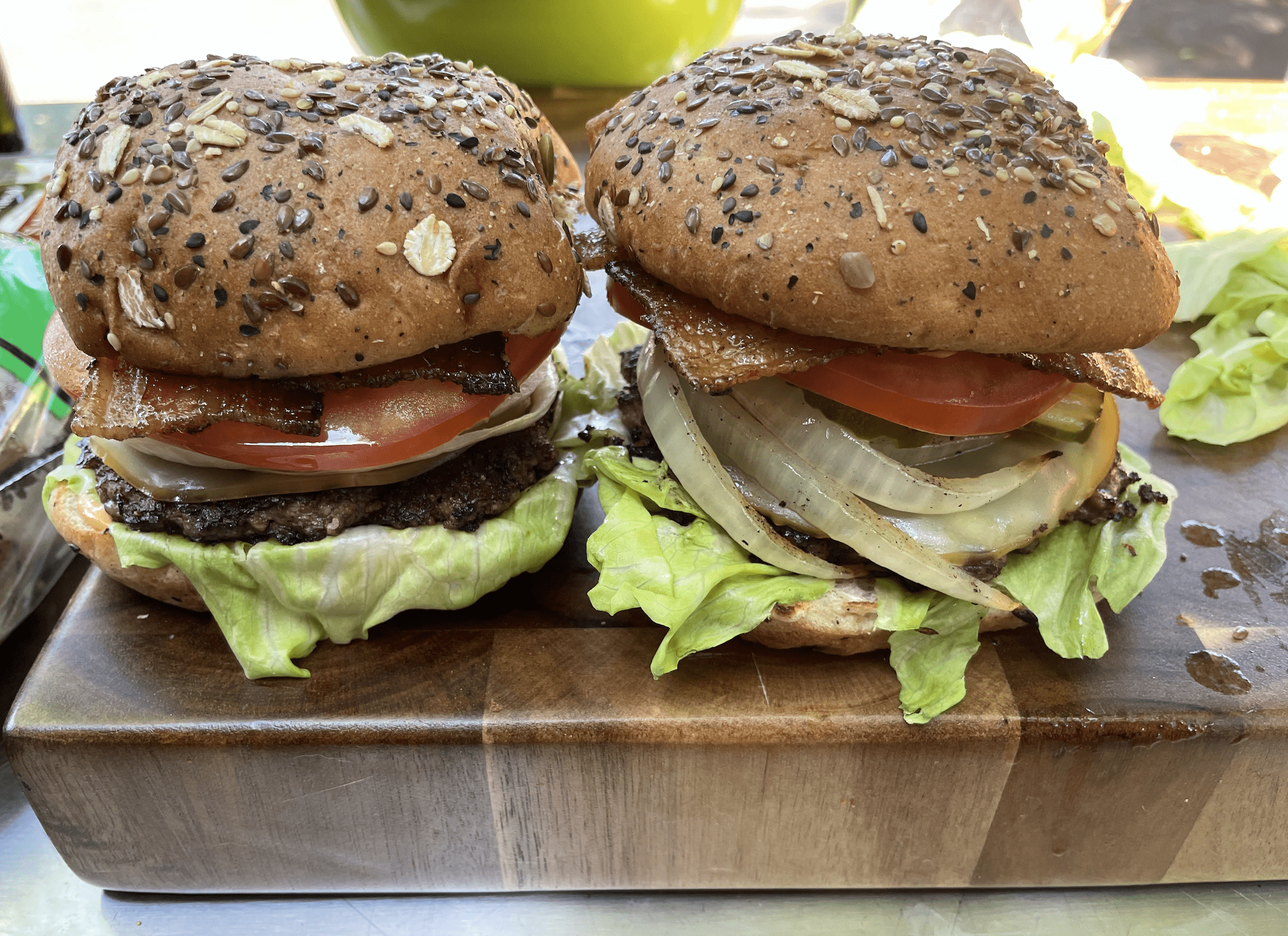 - When done, remove and assemble burger. I went bottom bun, burger sauce, lettuce, patty, onion, pickle, bacon and top bun (sauced).