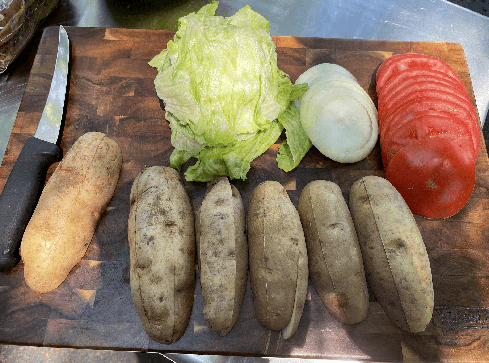 - Half your Russet potatoes length-wise and slice each half into three (3) wedges.