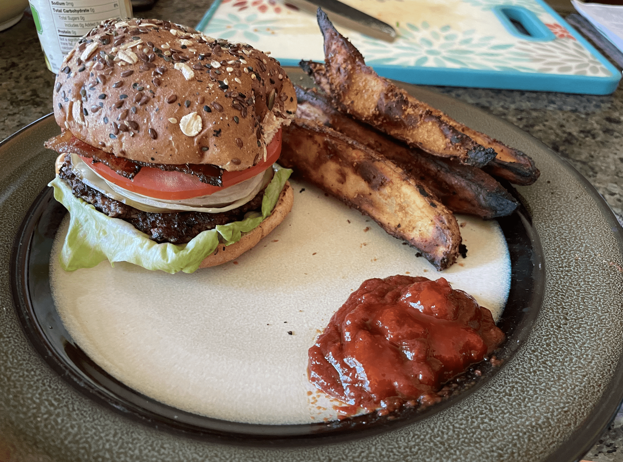 This was the plated burger. My ketchup blend was Sir Kensington’s Spicy Ketchup with a couple dashes of hot sauce (Mule Sauce from StickerMule). I haven’t had regular-ass ketchup in a long time without some hot sauce in it. To each their own.